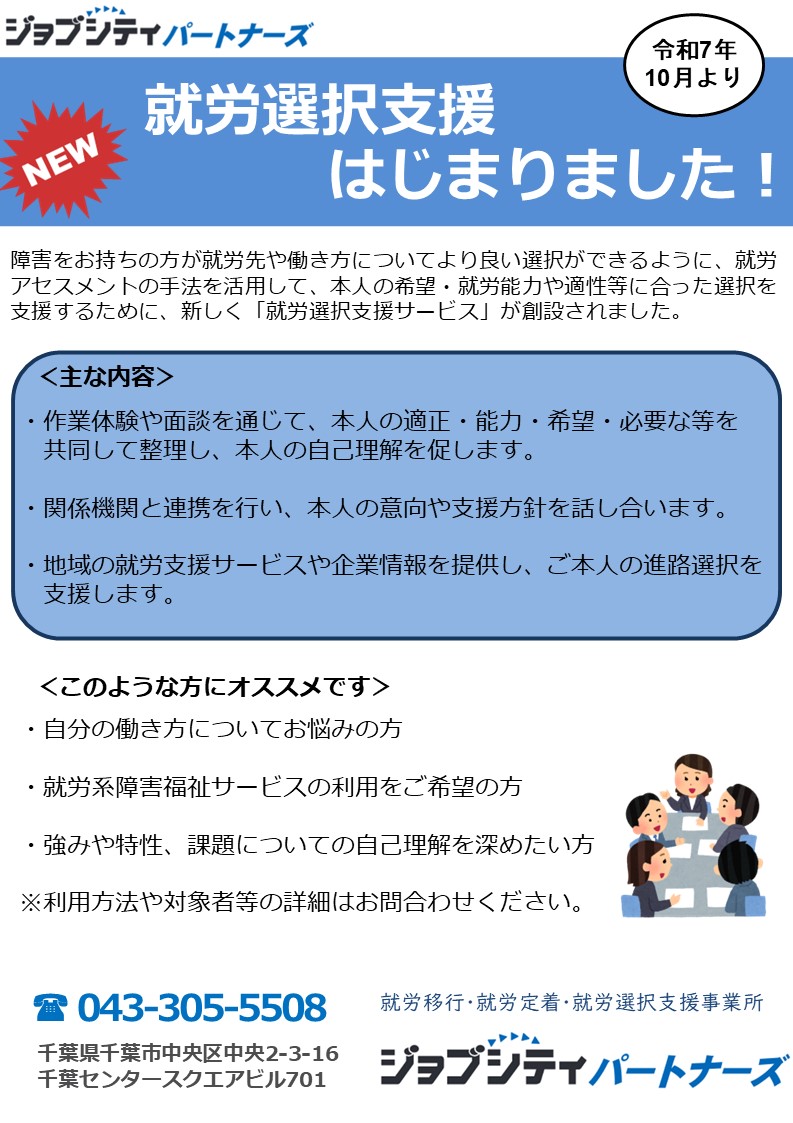 ジョブシティパートナーズでは、10月1日から、「就労選択支援」がはじまりました。 ・自分の働き方についてお悩みの方 ・就労系障害福祉サービスの利用をご希望の方 ・強みや特性、課題についての自己理解を深...